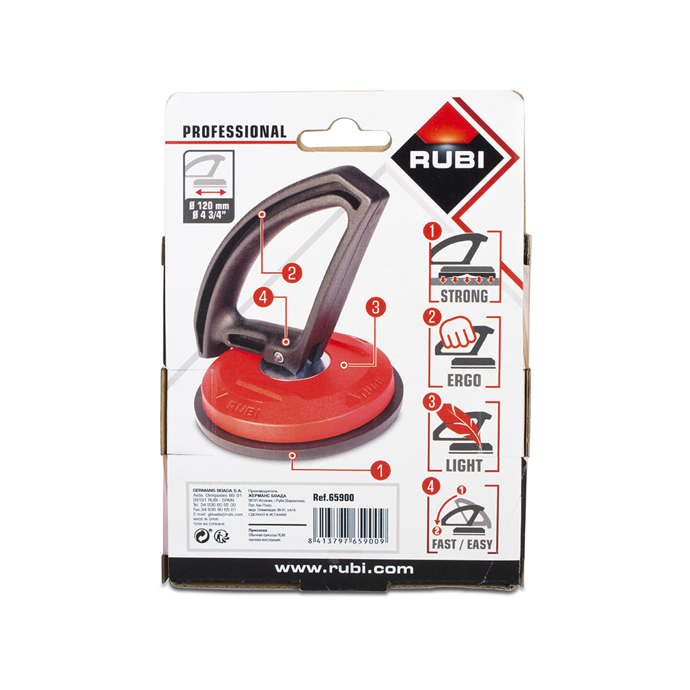 Предназначена для гладкой поверхности, подходит для премещения керамической плитки большого формата. Максимальная нагрузка на одинарную присоску RUBI составляет 40 кг.