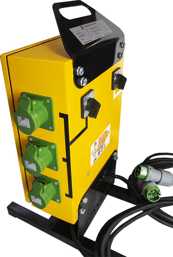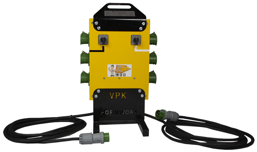 Разветвитель VPK Formwork 2/6 предназначен для подключения до 6-ти внешних вибраторов. Представляет собой коммутационное устройство с возможностью работы как от 1-ого преобразователя частоты, так и одновременно от 2-х независимых преобразователей. Для этого на входе имеются два кабеля с вилками 42В и 200 Гц. Минимальный ток каждой линии должен составлять 20 А. Каждый из двух кабелей питает группу розеток (3 шт) через переключатель для подключения шести внешних вибраторов.