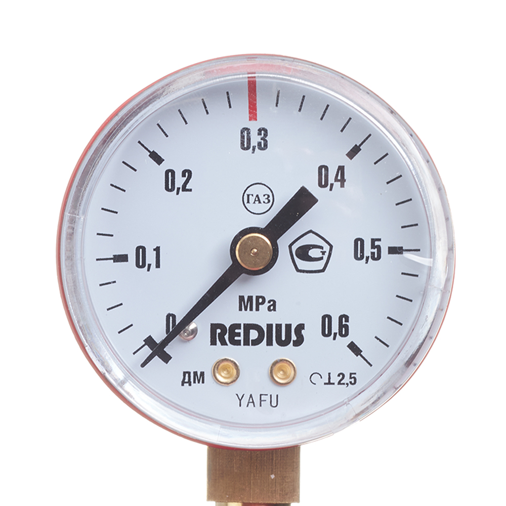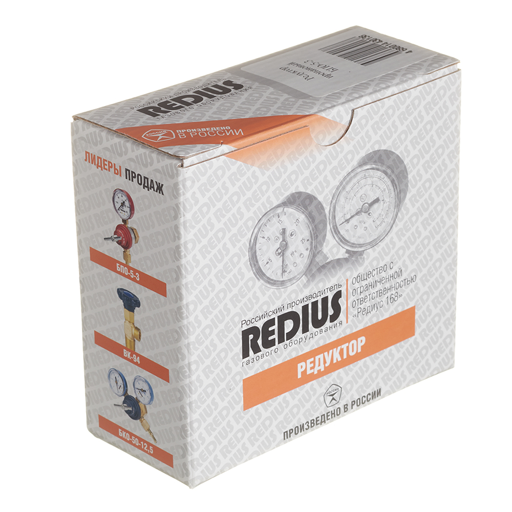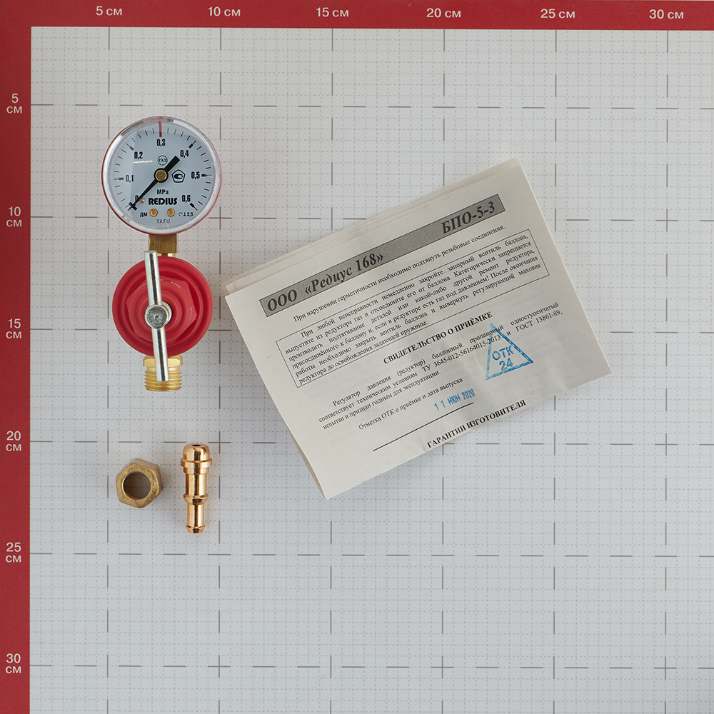 редуктор в собранном виде, ниппель универсальный под рукав резиновый диаметром 6,3 мм или 9,0 мм, гайка 19 мм, паспорт.