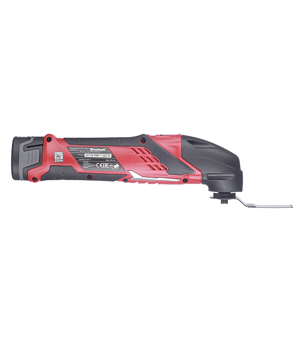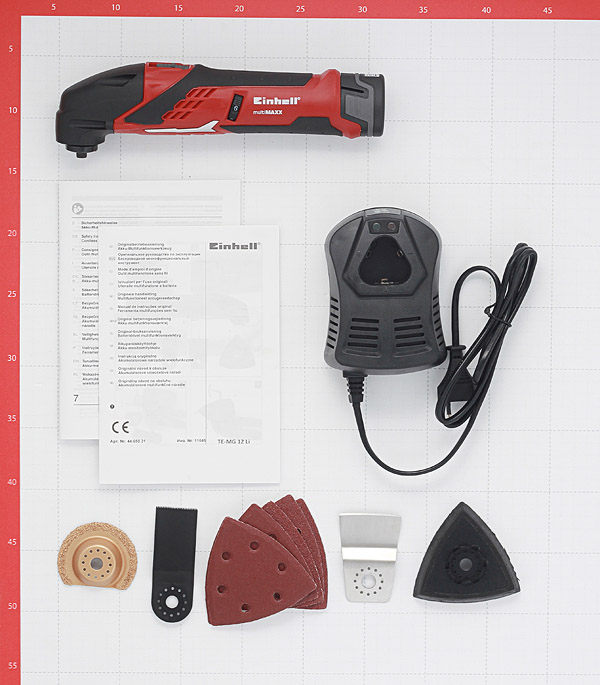 резак, один аккумулятор Li-Ion емкостью 1,3 Ач, зарядное устройство, кейс, ключ с внутренним шестигранником, набор оснастки: врезной пильный диск для дерева – 1 шт; скребок – 1 шт; треугольный шлифовальный диск – 1 шт, шлифовальная бумага (3 x дерево / 3 x сталь) – 6 шт; отрезной диск сегментный (TCT) для плитки – 1 шт.