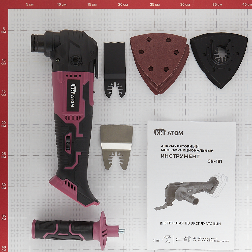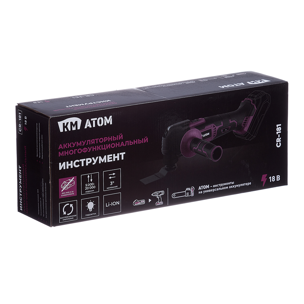 Этот инструмент входит в состав аккумуляторной платформы КМ АТОМ. rnВсе инструменты и садовая техника данной серии работают от универсальных аккумуляторов КМ АТОМ.rnМногофункциональный инструмент – это ручная электрическая машина с питанием от аккумуляторной батареи. В качестве привода использован коллекторный двигатель постоянного тока с постоянными магнитами, вращательное движение которого заменено колебательным. rnВозможность использования инструмента с разными рабочими принадлежностями позволяет выполнять широкий спектр работ:rn - распил и резка древесины и материалов на ее основе, пластмасс, цветных металлов, а также крепежных элементов (гвоздей, винтов и т.п.). rn - обработка мягкой керамической плитки, сухая шлифовка и шабровка небольших поверхностей. rn - мелкие работы по стендовому моделизму, слесарные, столярные работы, а также другие ручные работы, выполняемые домашними мастерами.rnПреимуществом инструмента является возможность обработки материалов в труднодоступных местах или вблизи кромок.rnВнимание! Зарядное устройство и аккумуляторная батарея в комплект не входят.