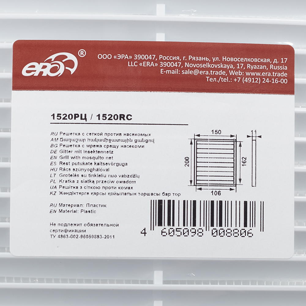 Решетка вентиляционная пластиковая приточно-вытяжная ERA 150х200 мм с сеткой белая