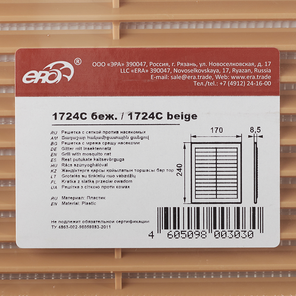 Решетка вентиляционная пластиковая приточно-вытяжная ERA 170х240 мм с сеткой бежевая