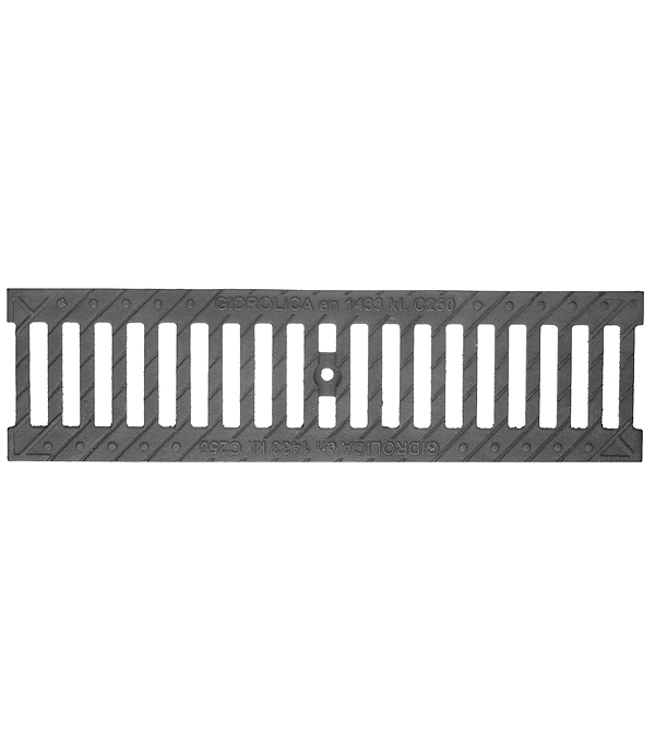 Решетка водоприемная, 500х136мм, чугунная кл.С250 Гидролика производится из высокопрочного чугуна марки Вч50.rnДанные решетки предназначены для покрытия лотков пластиковых водоотводных с сечением DN100 (арт.104642, 104643, 104644, 154628), бетонных (арт. 104640, 104648), полимерпесчаных (арт. 618476, 618477). Для пескоуловителей которые устанавливают обычно в конце линии лотков для обеспечения предварительной грубой очистки стоков от мусора (арт.139623). Пескоуловители накрываются теми же решетками, что и линия лотков к которым они устанавливаются. Решетки чугунные для лотков и пескоуловителей рассчитаны под автомобильную нагрузку кл. С250. Применяются в частном строительстве в зонах возможного движения легкового транспорта на въезде на участок, на въезде в гараж, и в других зонах, где будет осуществляться движение легковых автомобилей. Так же решетки чугунные для лотков и пескоуловителей применяются и в городском строительстве на парковках легковых автомобилей, дворовых территориях где ограничено движение только для легкового автотранспорта.