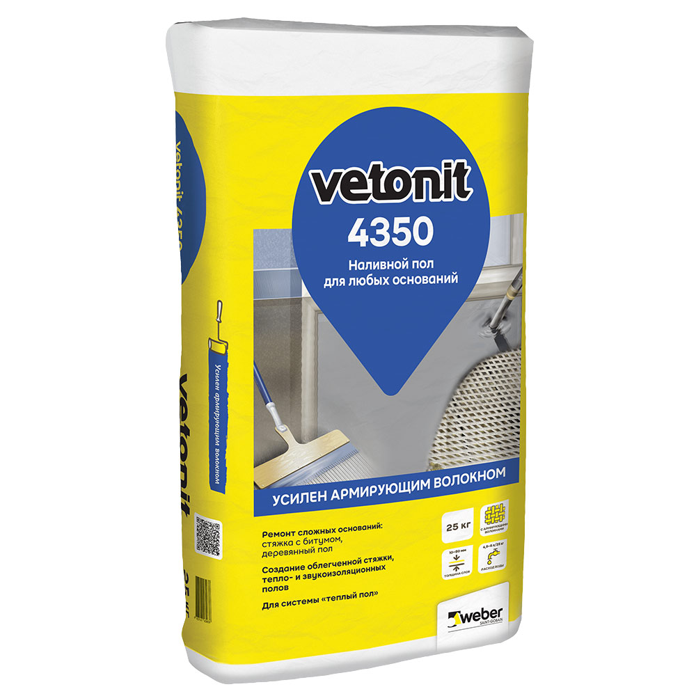 • С помощью насоса или вручную наливной пол weber.vetonit 4350 выливается на основание так, чтобы толщина слоя была в пределах от 10 до 50 мм. Материал распределяется по поверхности стальным зубчатым шпателем или игольчатым валиком, разравнивается и заглаживается.