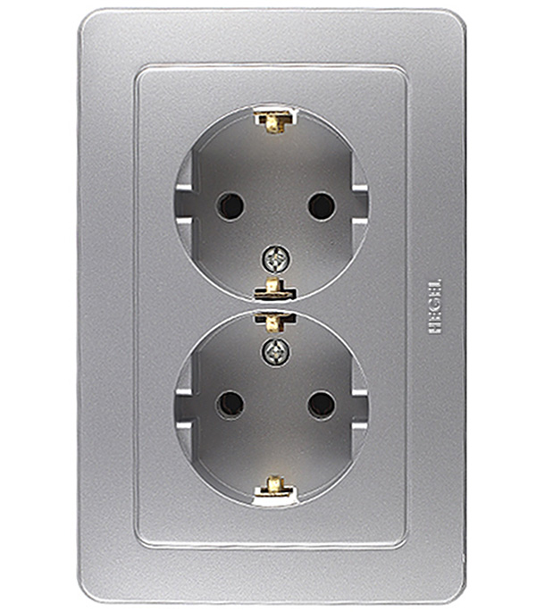 Розетка с рамкой HEGEL Master РС16-351-06 двойная скрытая установка серебро с заземлением