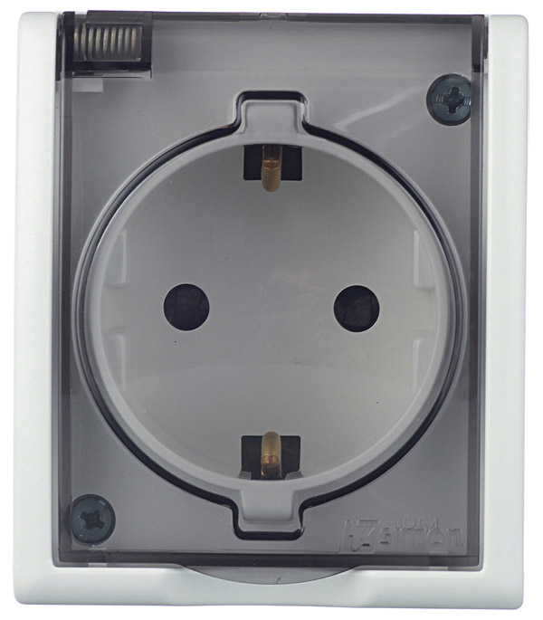 Розетка Simon 15 Aqua 1594432-030 открытая установка белая с заземлением IP54 с крышкой со шторками
