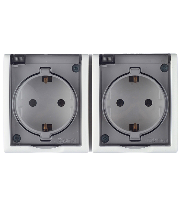 Розетка Simon 15 Aqua двойная 1594433-030 открытая установка белая с заземлением IP54 с крышкой