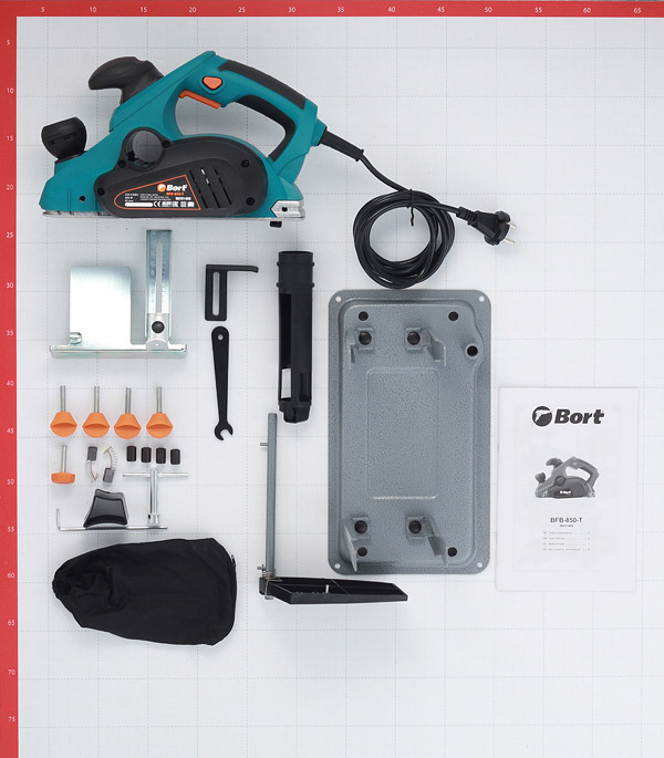 параллельная направляющая, пылесборный мешок, ключ, ограничитель глубины выборки четверти, дополнительный комплект щеток, рама, защита ножа, блокиратор кнопки включения, заточное приспособление, шаблон для установки ножей.