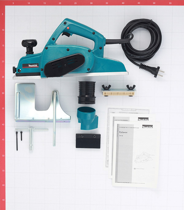рубанок, твердосплавный нож, держатель для заточки лезвия, шаблон для фиксации ножа, параллельный упор, торцевой ключ, патрубок для пылесоса.