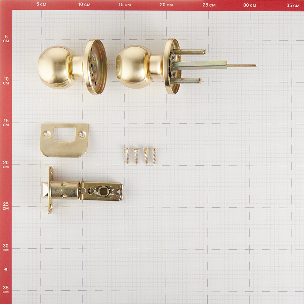 2 ручки, защелка, ответная планка, пластиковая вставка под ответную планку и шурупы.