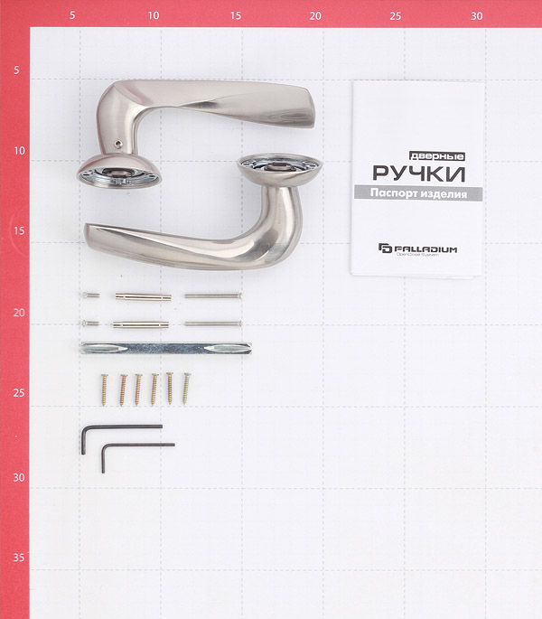 2 ручки, квадрат 8х105 мм, стяжки, крепеж, инструкция по установке, гарантийный талон.