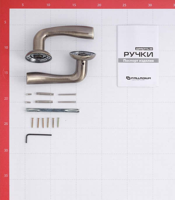 2 ручки, квадрат 8х105 мм, стяжки, крепеж, инструкция по установке, гарантийный талон.