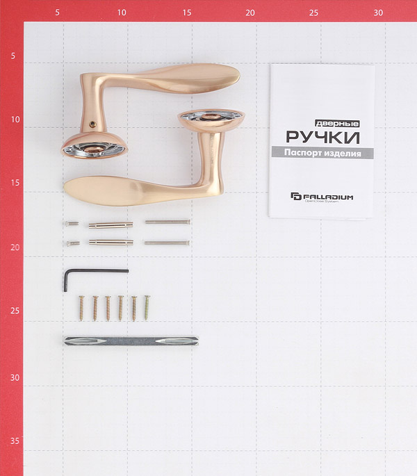 2 ручки, квадрат 8х105 мм, стяжки, крепеж, инструкция по установке, гарантийный талон.