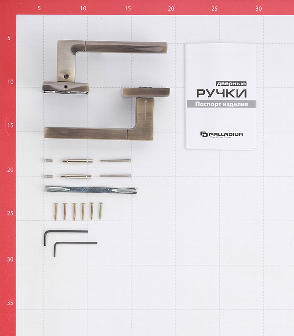 2 ручки, квадрат 8х105 мм, стяжки, крепеж, инструкция по установке, гарантийный талон.