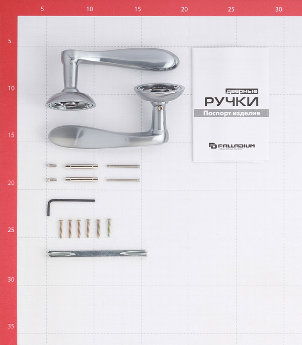2 ручки, квадрат 8х105 мм, стяжки, крепеж, инструкция по установке, гарантийный талон.