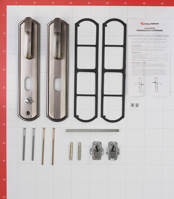 2 ручки на планке, уплотняющие прокладки под ручки, квадрат, защитная накладка на цилиндр, стяжные винты для крепления ручек.