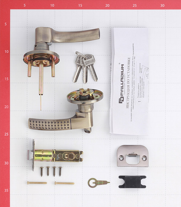 ручки, защелка, ответная планка, пластиковая вставка под ответную планку и шурупы.