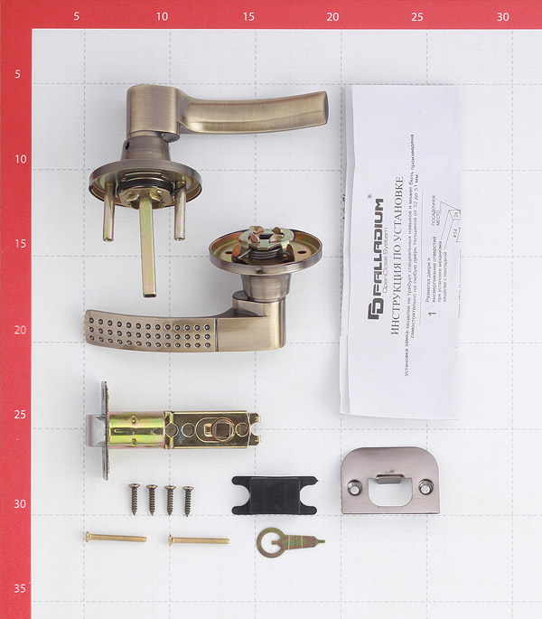 ручки, защелка, ответная планка, пластиковая вставка под ответную планку и шурупы.