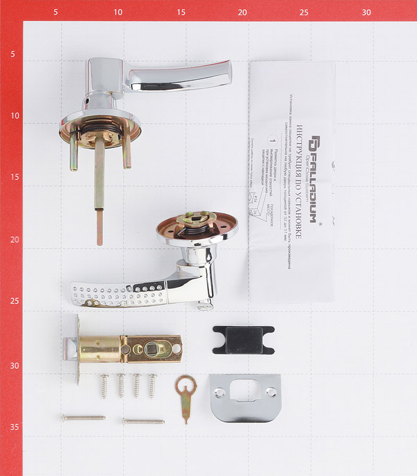 ручки, защелка, ответная планка, пластиковая вставка под ответную планку и шурупы.