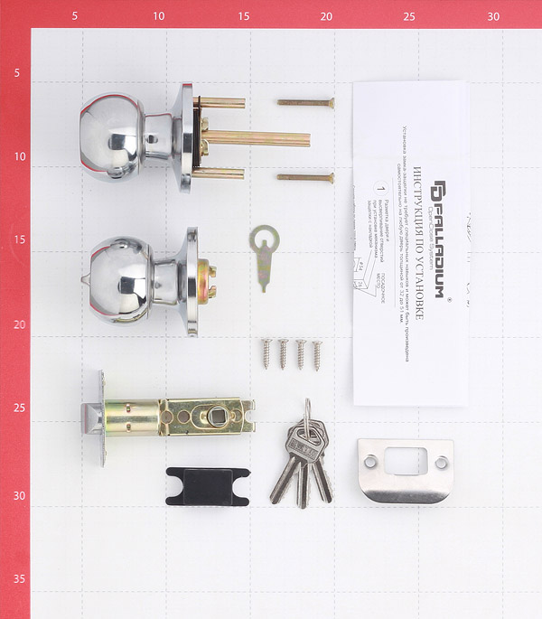 ручки, защелка, ответная планка, пластиковая вставка под ответную планку и шурупы.