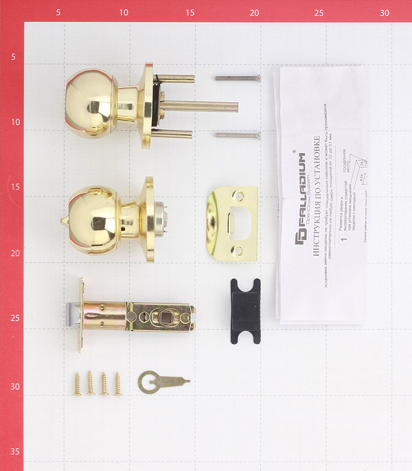 ручки, защелка, ответная планка, пластиковая вставка под ответную планку и шурупы.