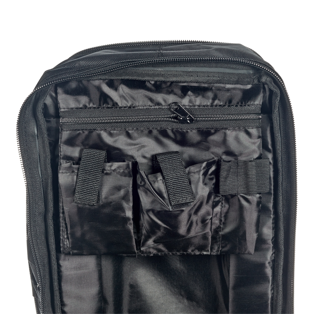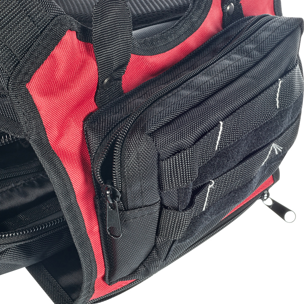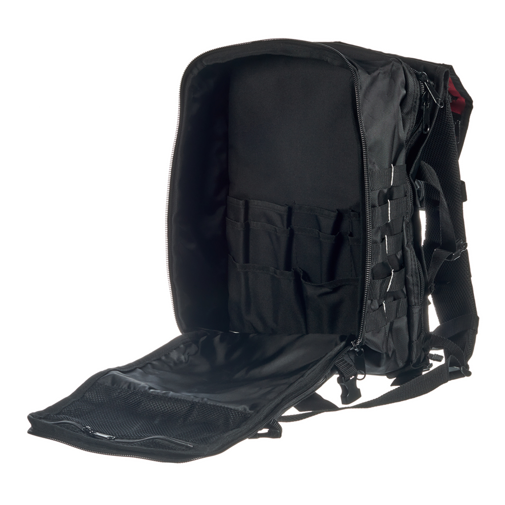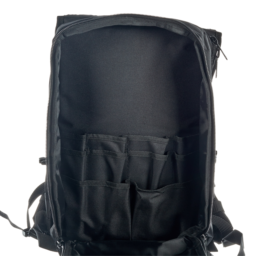 Предназначен для хранения и транспортировки инструмента. Имеет широкие мягкие регулирующиеся лямки, регулируемый поясной ремень и ручка для переноски, защелки-фиксаторы для изменения объема рюкзака, светоотражающие элементы на внешнем фронтальном кармане рюкзака, мягкие анатомические вставки на спинке рюкзака, прочные усиленные молнии с крупными звеньями. Рюкзак выдерживает вес до 10 кг.rnКонструкция – переднее и заднее внутренние отделения с отдельными молниями; переднее отделение с 10 карманами; заднее отделение с большим широким плоским карманом, 2 карманами из капроновой сетки и вшитым нейлоновым карманом на молнии с 3 крепежными элементами из резиновой ленты и 2 кармашками на липучках.rn2 внешних фронтальных каскадных кармана на молнии, 15 крепежных элементов из светоотражающей ленты и 15 крепежных элементов из капроновой ленты на фронтальной части рюкзака.rnВерхний клапан рюкзака оборудован 2 карманами на молнии и 6 крепежными элементами из капроновой ленты.rnВ одном из карманов на клапане рюкзака вшит внутренний нейлоновый карман и 3 крепежных элемента из резиновой ленты.