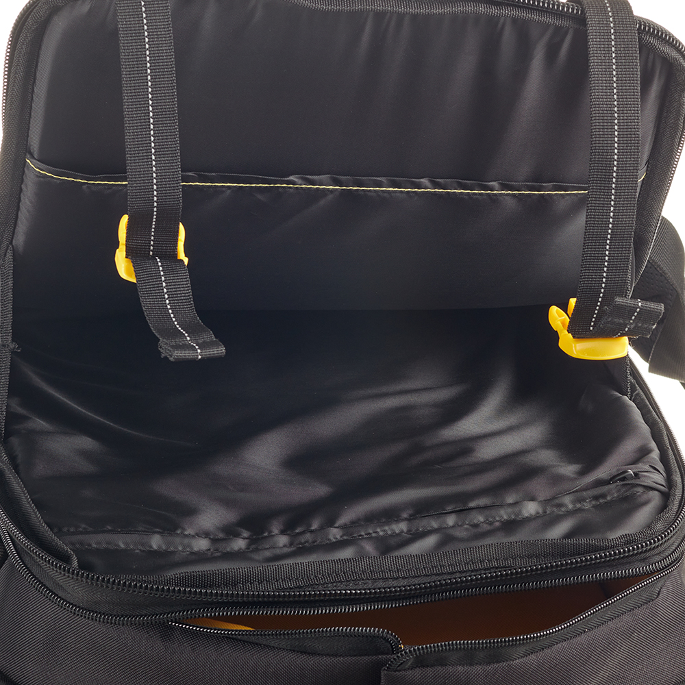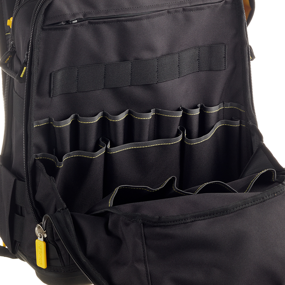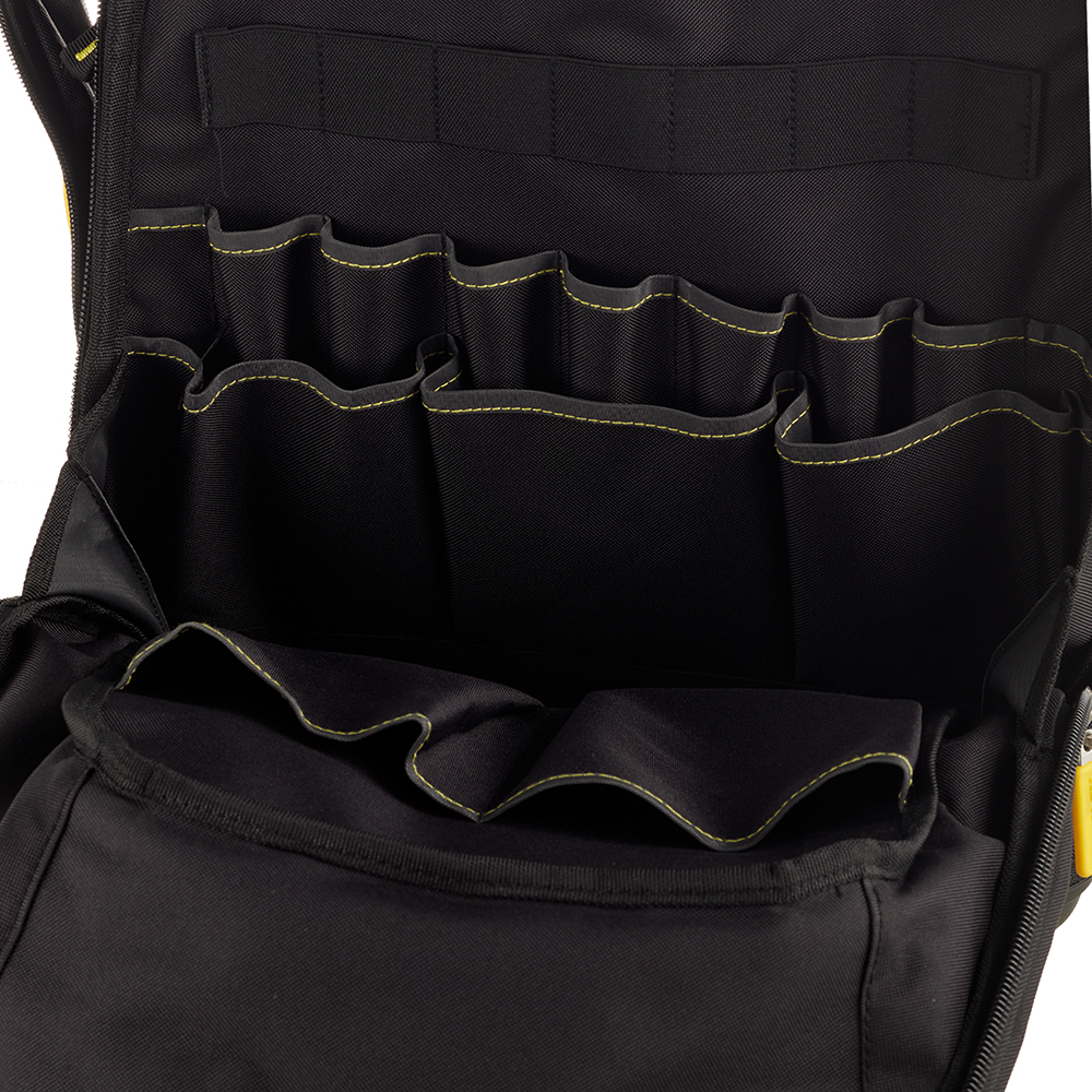 Рюкзак для инструмента – рабочая станция с 4-мя отделениями. Предназначен для хранения и транспортировки инструмента. Имеет съемный разделитель с карманами для размещения часто используемого инструмента, а также отделение для электроинструмента либо ноутбука. На передней стенке имеется отделение для хранения личных вещей. Конструкция сочетает высокопрочный высококачественный гибкий полиэтиленовый материал тарпаулин с полиэстровой тканью плотностью 600 денье. Большое открытое отделение для быстрого доступа к длинным инструментам, органайзерам, электроинструменту и т.п. Множество карманов и держателей для различного инструмента. Защищенное мягкими вставками отделение для ноутбука. Отделение для личных вещей: кошелька, ключей, мобильного телефона и т.п. Эргономичные мягкие вставки на задней стороне рюкзака. Лямки с мягкими вставками для комфорта при переноске тяжелого содержимого. Жесткое водонепроницаемое пластиковое дно.