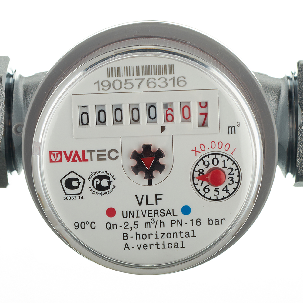 Водосчетчик универсальный – для измерения расхода холодной и горячей воды, главным образом – в квартирах. Для данной модели установлен увеличенный межповерочный интервал – 6 лет (на холодную и горячую воду).rnПрисоединительная резьба корпуса – 1резьба соединительных полусгонов 3/4.