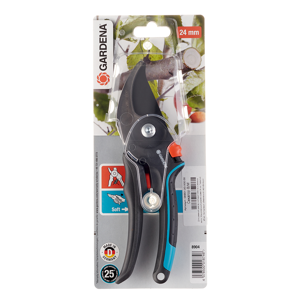 Секатор B/M со сверхузкой режущей головкой для аккуратной обрезки виноградной лозы, цветов, молодых побегов и зеленых веток. Лезвия прецизионной заточки имеют покрытие от налипания. Два положения захвата позволяют производить как мощную обрезку, так и быстрое срезание. Удобные ручки снабжены мягкими элементами. В секаторах предусмотрен желобок для стекания сока растений и резак для проволоки. Фиксатор, переключаемый одной рукой, дает возможность с легкостью заблокировать секатор для безопасного хранения. Секаторы B/M срезают ветки диаметром до 24 мм. 25-летняя гарантия подтверждает высочайшее качество продукции.rnДвухлезвионные секаторы обеспечивают чистый и ровный срез. Поэтому секаторы GARDENA идеально подходят для обрезки цветов и молодых веток.rnБлагодаря рукояткам эргономичной формы секатор удобно лежит в руке. Компоненты из мягкого пластика обеспечяивают надежный хват и комфортную работу.rnБлагодаря продуманной эргономике секатор легко перевести в закрытое положение при помощи одной руки.rnСекаторы GARDENA производятся в Германии, что подтвержает высокое качество.