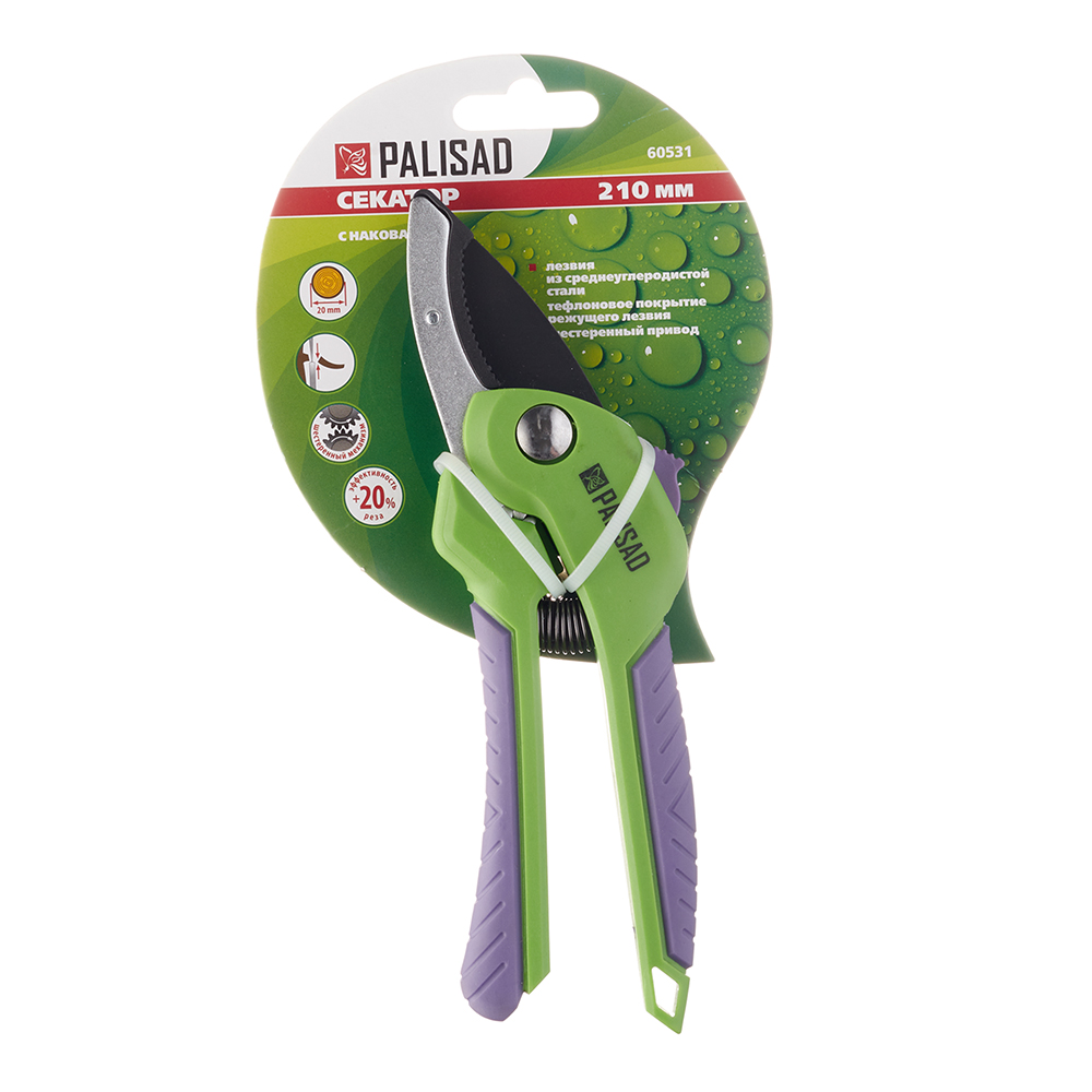 Предназначен для обрезки сухих и твердых веток деревьев и кустарников диаметром до 22 мм. Секатор с двухкомпонентными рукоятками и верхним лезвием из стали У8, покрытой тефлоном, с упорной наковальней. Зубчики на наковальне удерживают ветку во время работы.rn Шестеренная передача увеличивает усилие реза до 20%.