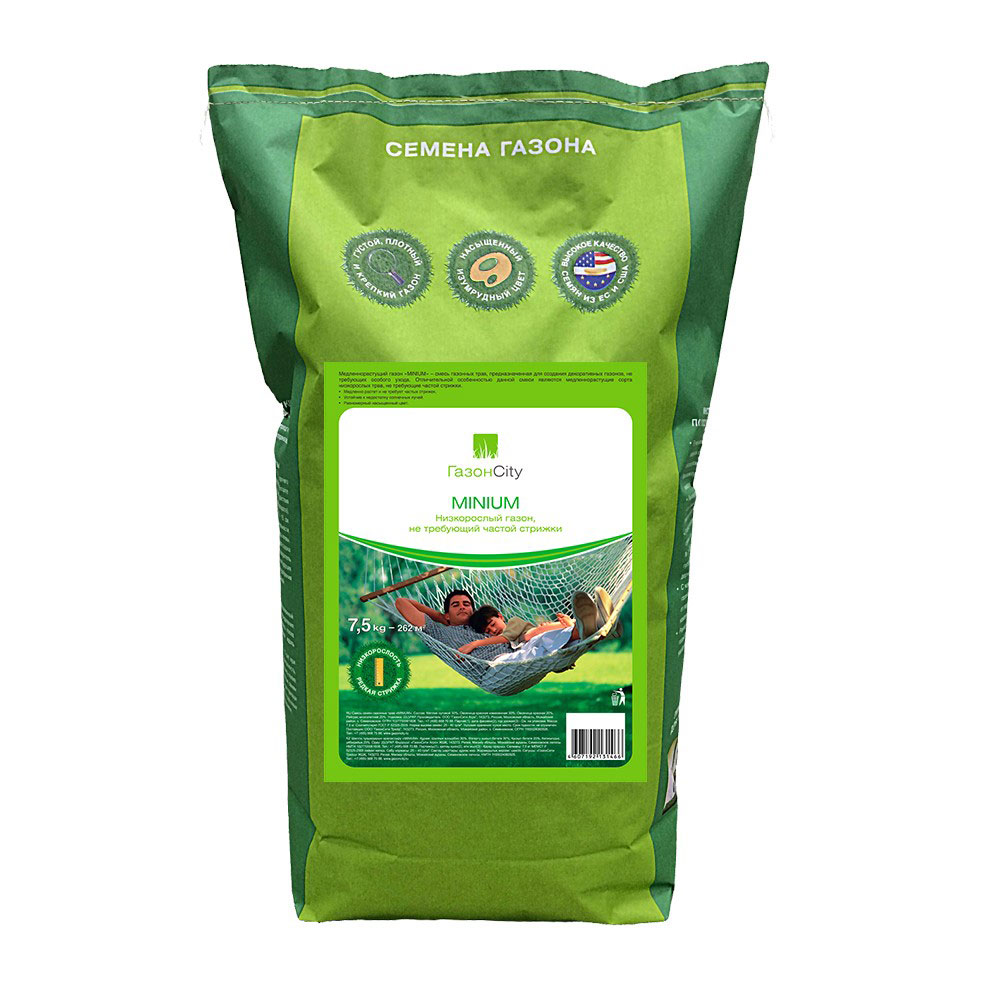 Медленно растущий газон MINIUM – смесь газонных трав, предназначенная для создания декоративных газонов, не требующих особого ухода. Отличительной особенностью данной смеси являются медленно растущие сорта низкорослых трав, не требующие частой стрижки. Упаковка 7.5 кг рассчитана на 262 м².