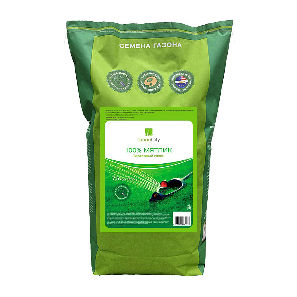Партерный газон 100% МЯТЛИК – смесь газонных трав, предназначенная для создания устойчивых декоративных газонов на участках с повышенными эстетическими требованиями. Упаковка 7.5 кг рассчитана на 262 м².