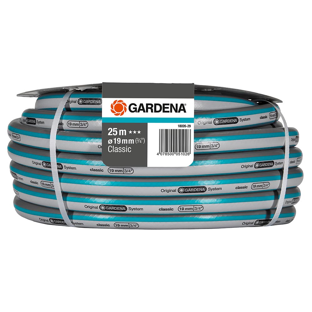 Для полива садового участкаrnДиаметр 19 мм (3/4)rnДлина 25 мrnУстойчивость к перегибам, спутыванию и перекручиваниюrnУстойчивость к давлению и деформации, стабильность формыrnГибкостьrnДавление на разрыв 22 бар. rnОтсутствие фталатов и тяжелых металловrnУстойчивость к УФ-излучениюrnШланг GARDENA Classic, прекрасно сохраняет свою форму благодаря высококачественному текстильному армированию, отсутсвуют фталаты и тяжелые металлы, невосприимчив к УФ-излучениюrnШланг GARDENA Classic оптимально сочетается с компонентами Original GARDENA SystemrnИдеально подходит для умеренной интенсивности использования
