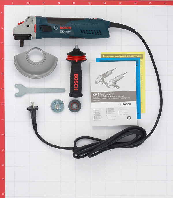 шлифмашина, защитный кожух, рожковый ключ, зажимная гайка, дополнительная рукоятка.