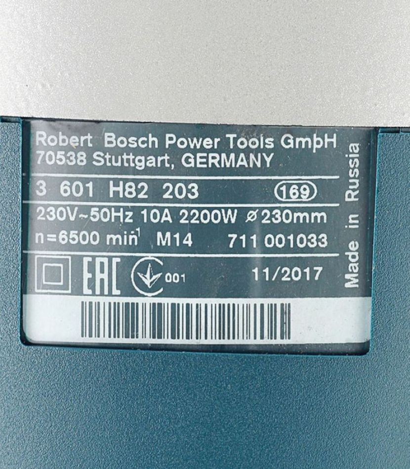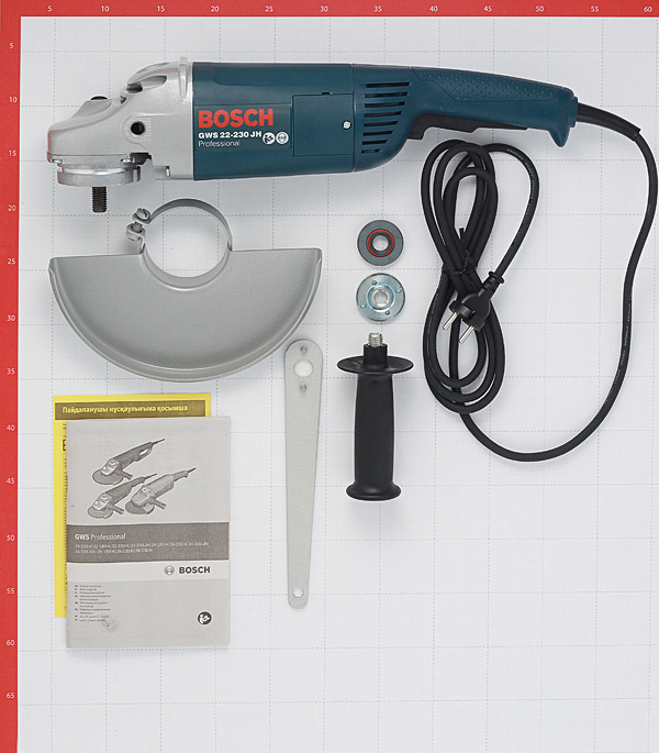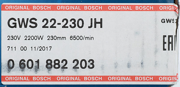 GWS 22-230 – модель угловой шлифмашины, J – ограничение пускового тока, H – открытая форма рукоятки, 2200 Вт – потребляемая мощность, 230 мм – диаметр круга.