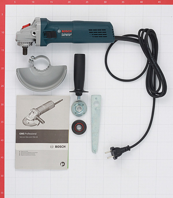 шлифмашина, защитный кожух, рожковый ключ, зажимная гайка, дополнительная рукоятка.