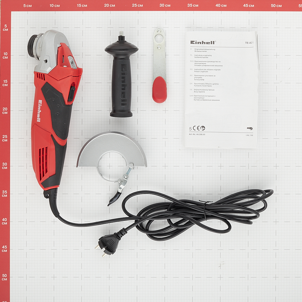 УШМ, дополнительная рукоятка, ключ для фиксации дисков, зажимные гайки, инструкция, коробка.