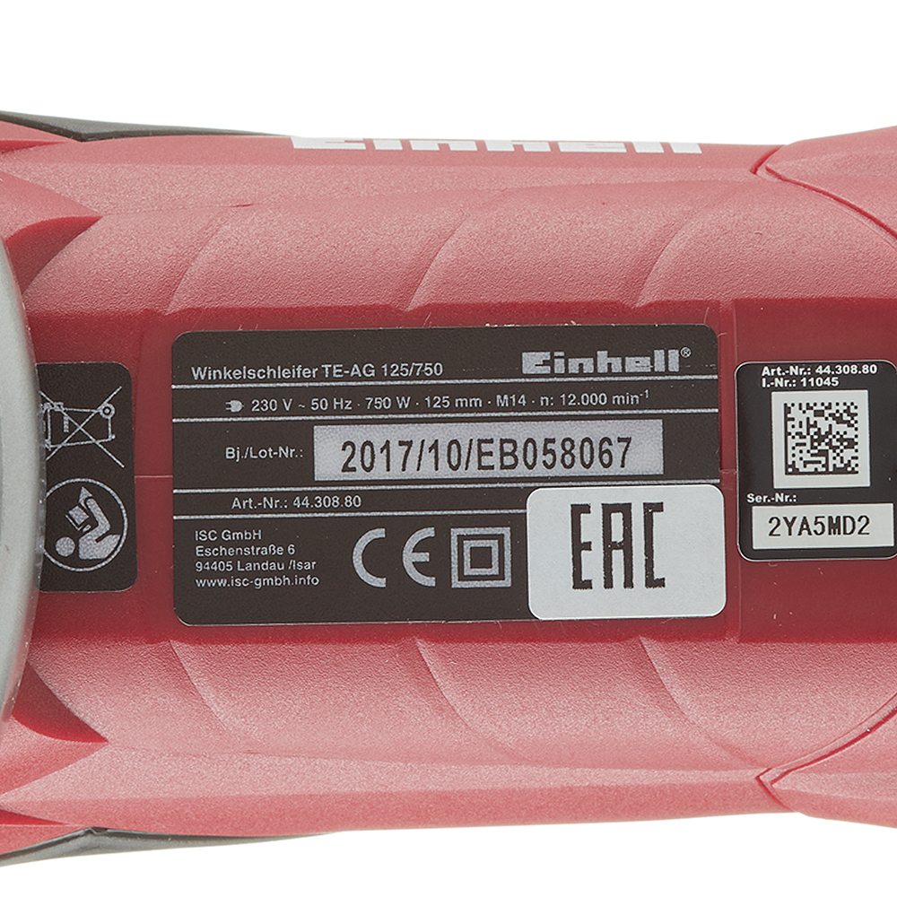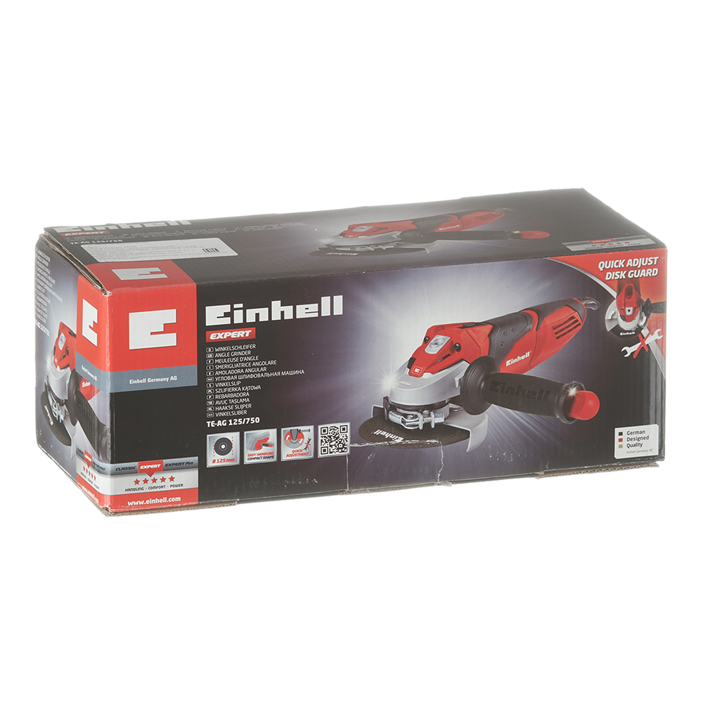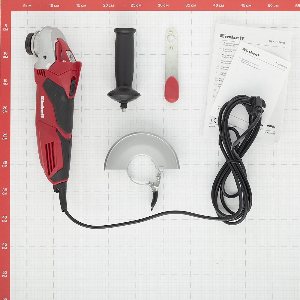 Угловая шлифмашина Einhell TE-AG 125/750 предназначена для шлифования и зачистки деталей из металла и прочих материалов, а так же для резания.rnШлифмашина обладает отличной производительностью при проведении сложных работ по резке металла, шлифовке и различных черновых работах в доме, гараже или мастерской.rnРегулировка защитного кожуха диска производится без использования дополнительного инструмента.rnЗамена диска облегчается за счет блокировки шпинделя, ключ для откручивания прижимной гайки диска хранится в рукоятке.