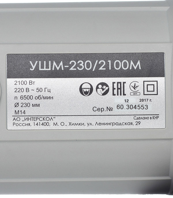 УШМ-230/2100М – модель углошлифовальной машины, 2100 Вт – мощность, 230 – диаметр круга.