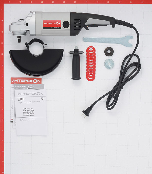 машина шлифовальная угловая, руководство по эксплуатации и инструкция по безопасности, гарантийный талон, кожух защитный, доп. рукоятка, ключ специальный, гайка крепления шлифовального диска, фланец опорный.