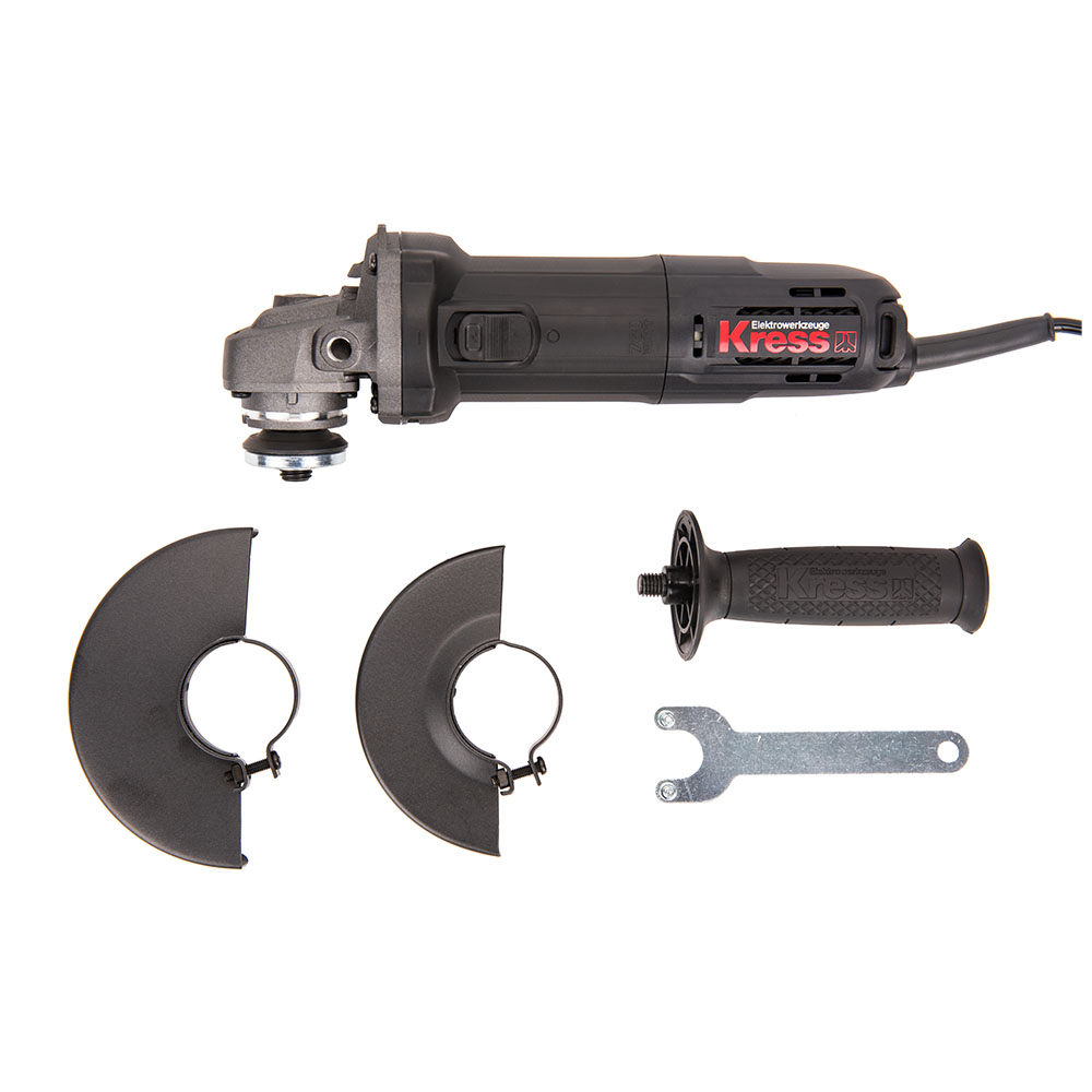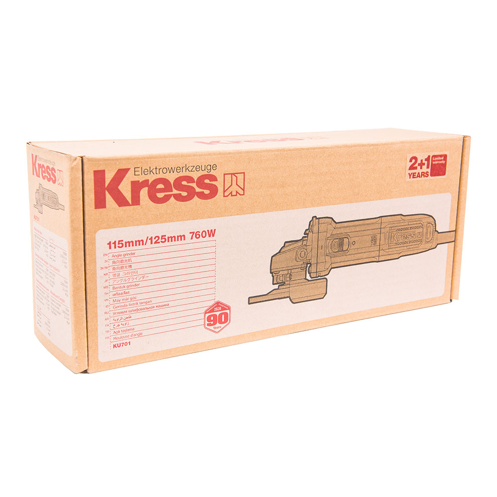 УШМ KRESS KU701, антивибрационная боковая рукоятка, кожух защитный 115 мм, кожух защитный 125 мм, картонная коробка.