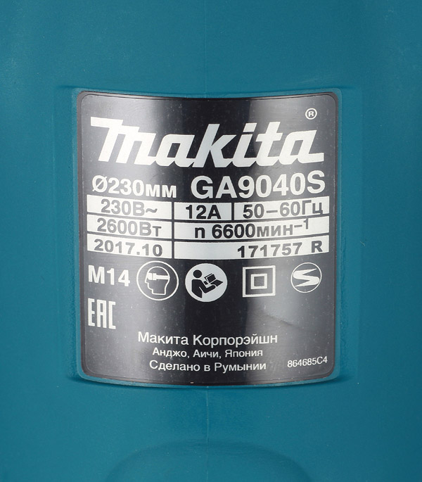 GA 9040 SF 01 – модель шлифмашины, 2600 Вт – мощность, 230 мм – диаметр диска.