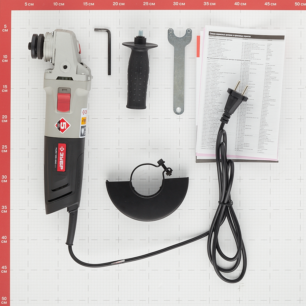 Углошлифовальная машина – 1шт., Кожух защитный – 1 шт., Рукоятка дополнительная – 1 шт., Ключ – 2 шт., Руководство по эксплуатации – 1 экз.