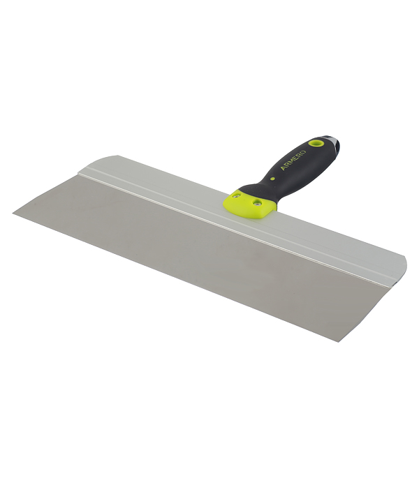 Предназначен для нанесения и выравнивания по поверхностям шпаклевок и других строительных растворов, заделки трещин и швов. Имеет 2 – компонентную прорезиненную ручку. Рабочее полотно шпателя изготовлено из нержавеющей стали.