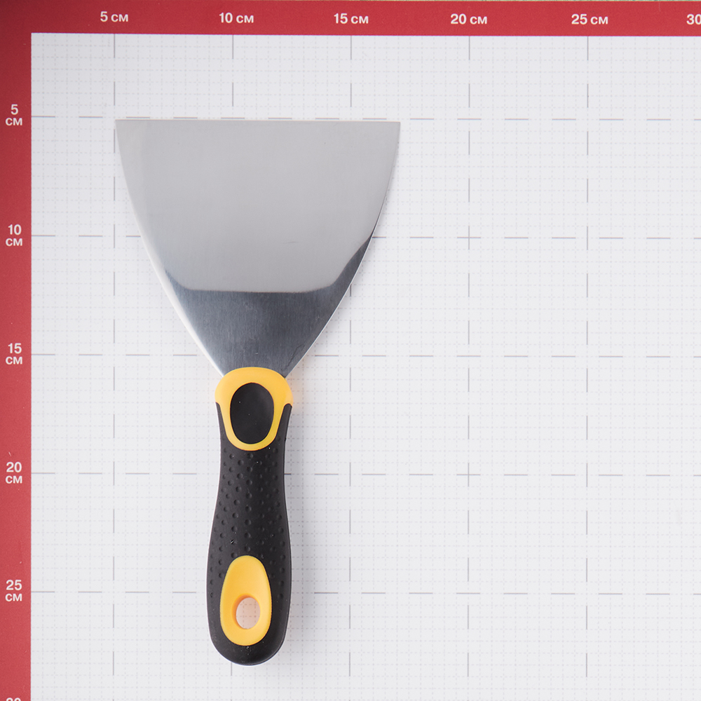 Шпатель из нержавеющей и лакированной стали, усиленный. Рукоятка изготовлена из двухкомпонентного материала.
