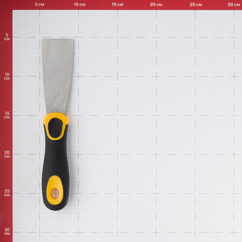 Шпатель из нержавеющей и лакированной стали, усиленный. Рукоятка изготовлена из двухкомпонентного материала.