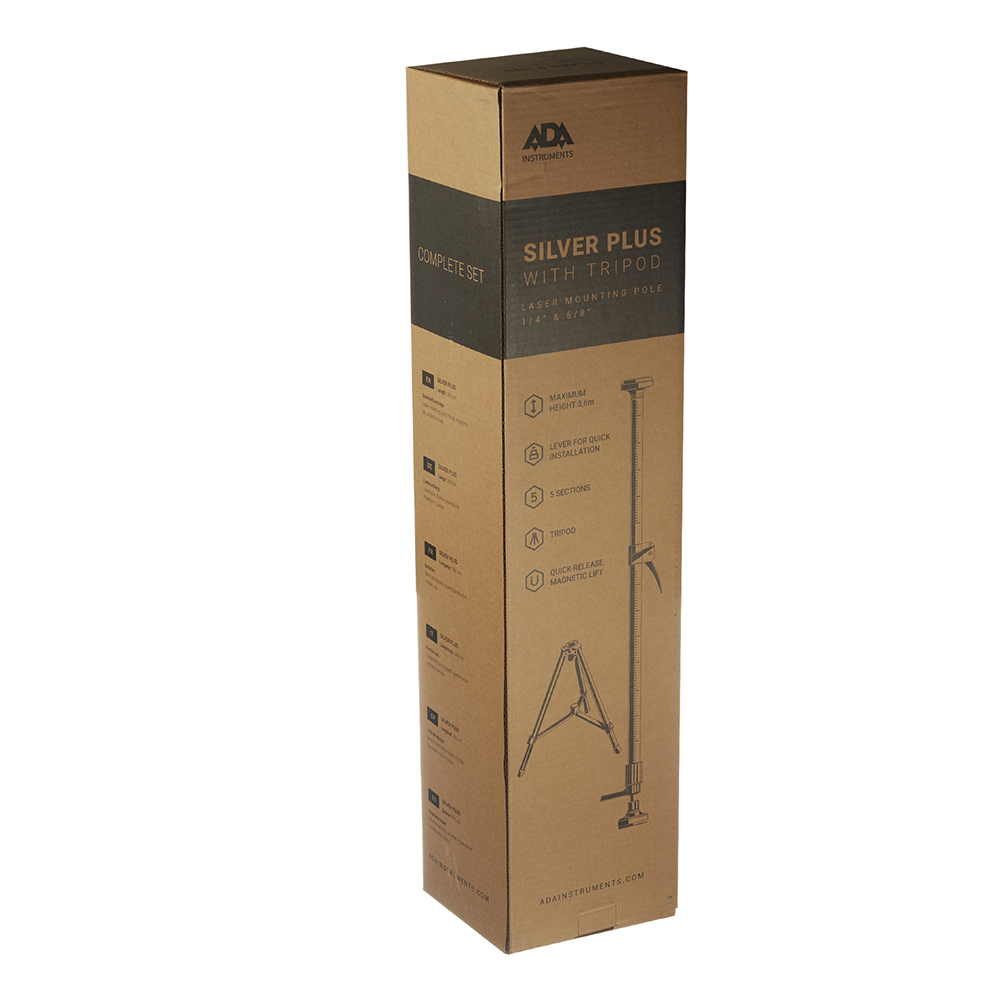 Штатив-штанга для лазерных уровней (нивелиров) ADA Silver PLUS с треногой – алюминиевая штанга состоит из нескольких секций, которые могут быть скручены между собой для работы с разной высотой. Идеально подходит тем, кто выполняет разметку в квартирах и домах с высотой потолков до 3,6 метров.rnADA Silver PLUS надежно устанавливается в распор между полом и потолком. Для скорости установки внизу раздвижной секции установлена специальная педаль для ноги: ставим штангу на пол, нажимаем на педаль ногой и упираем в потолок. Быстро и просто. Если в помещении нет возможности установить ADA Silver PLUS в распор между полом и потолком используется специальная тренога из комплекта. Она превращает ADA Silver PLUS в классический штатив.rnДля удобного крепления лазерных уровней в комплект специально включен ADA MAGNETIC LIFT – магнитное крепление с микролифтом. Крепление изготовлено из высокопрочного пластика стойкого к ударам. rnКрепить на ADA MAGNETIC LIFT можно лазерные уровни с резьбой 1/4 или 5/8 дюйма.rnДля транспортировки и хранения ADA Silver PLUS с треногой весь разобранный комплект укладывается в специальную сумку.
