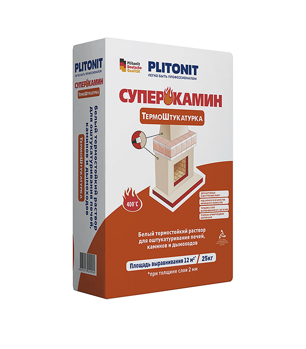 Условия проведения работrnПри проведении работ и в течение последующих 3 суток после их окончания необходимо обеспечить поддержание температуры воздуха и кирпичей в пределах от +5°С до +30°С. Температура растворной смеси в процессе проведения работ – от +10 °С до +30 °С.rnПодготовка основыrnОштукатуривание производится только после полной просушки и усадки печи.rnОснование под штукатурку должно быть прочным, не подверженным усадке или деформации, очищенным от грязи, пыли, масел, жиров и всех видов красок, а также отслаивающихся элементов.rnНепосредственно перед оштукатуриванием печь рекомендуется протопить.rnПодготовленное основание перед нанесением штукатурки необходимо обработать грунтовкой Плитонит Грунт и высушить в течение 1 часа.rnПриготовление растворной смесиrnДля затворения сухой смеси использовать воду из питьевого водоснабжения. Соотношение при смешивании: на 1 кг сухой клеевой смеси требуется 0,18 – 0,22 л воды (4,5 – 5,5 л на 25 кг). Сухую смесь засыпать в заранее отмеренное количество воды и перемешать в течение 2-3 минут с помощью электромиксера или электродрели с насадкой с частотой вращения не более 600 об/мин до получения однородной консистенции. Дать растворной смеси отстояться 10 минут и повторно перемешать. При повторном перемешивании разрешается добавление воды до максимального значения вышеуказанного соотношения. Время использования готовой растворной смеси – не более 4-х часов.rnПорядок работыrnНе допускается соприкосновение раствора и металлических изделий. При необходимости второй слой наносится после полного высыхания первого слоя. Время высыхания зависит от толщины слоя, температуры основания и условий окружающей среды. При нанесении штукатурки расшивка швов необязательна. С помощью фигурного шпателя можно создавать декоративную фактуру. Возможна окраска по штукатурке специальными термостойкими красками. После окончания штукатурных работ конструкцию необходимо просушить естественным путем. Через 7 суток возможно начало эксплуатации конструкции при условии, что температура наружной поверхности не будет превышать + 50⁰С. Полноценная эксплуатация возможна через 10-14 суток.