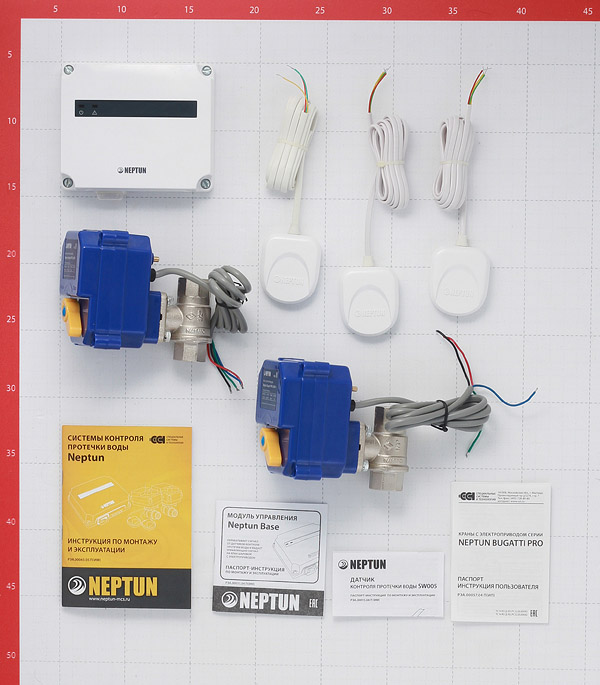 Модуль управления Neptun Base, 1 шт.; Датчик Нептун SW 005, 3 шт.; Кран шаровый с электроприводом Bugatti Pro 220В 1/2, 2 шт.